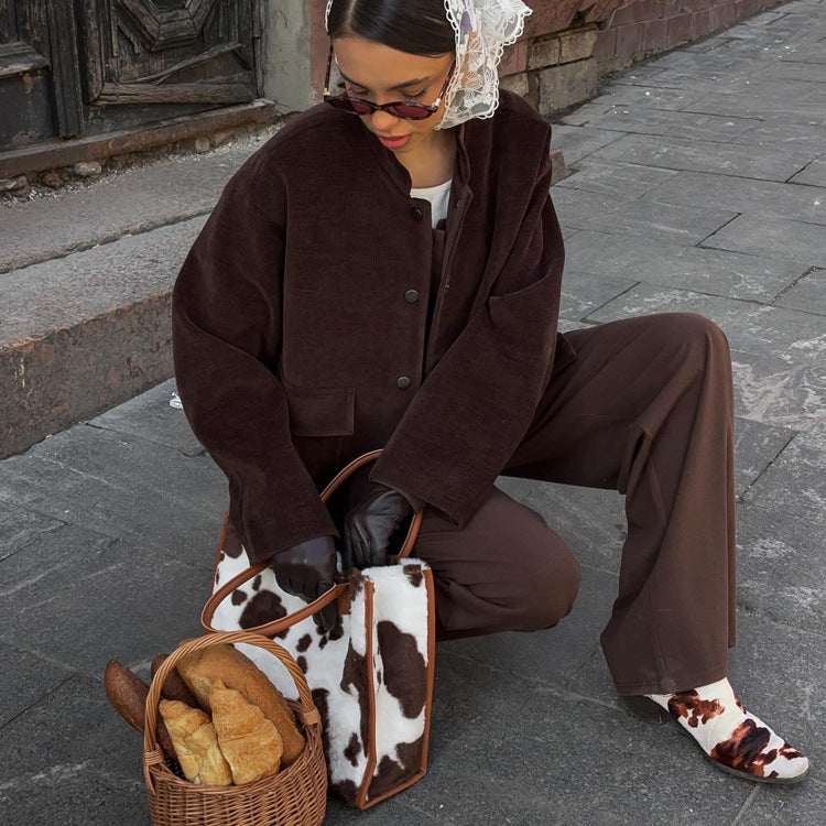 Step into timeless elegance with our Chocolate Corduroy Jacket – a versatile statement piece designed for modern women who value comfort and style. Crafted from premium polyester corduroy with over 95% high-quality fiber content, this jacket delivers both durability and luxurious texture. The stand-up collar and structured silhouette give it a chic, urban edge, while the deep brown tone adds warmth and sophistication to any outfit.