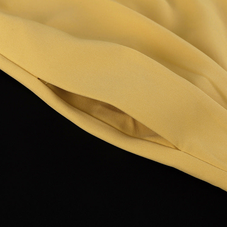 Command the room. This two-piece suit set pairs an exaggerated, power-shoulder blazer with fluid, wide-leg pants for a modern, high-fashion silhouette in a striking chartreuse tone.