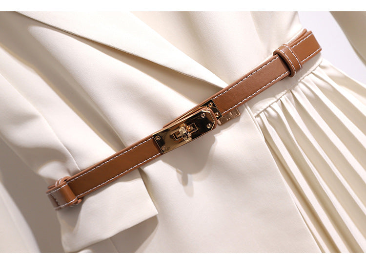 The blazer-inspired upper design combined with the pleated skirt brings together modern sophistication and effortless chic.